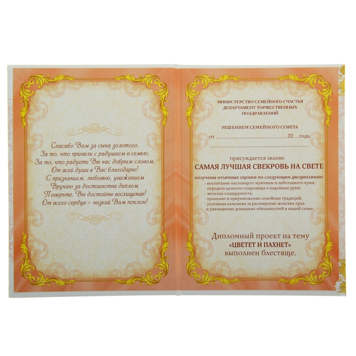 Диплом "Самая лучшая свекровь", изготовленный из качественного ламинированного картона и бумаги, сможет занять достойное место среди официальных документов адресата, ведь он вручен ему по праву, за самые исключительные заслуги в свое области!