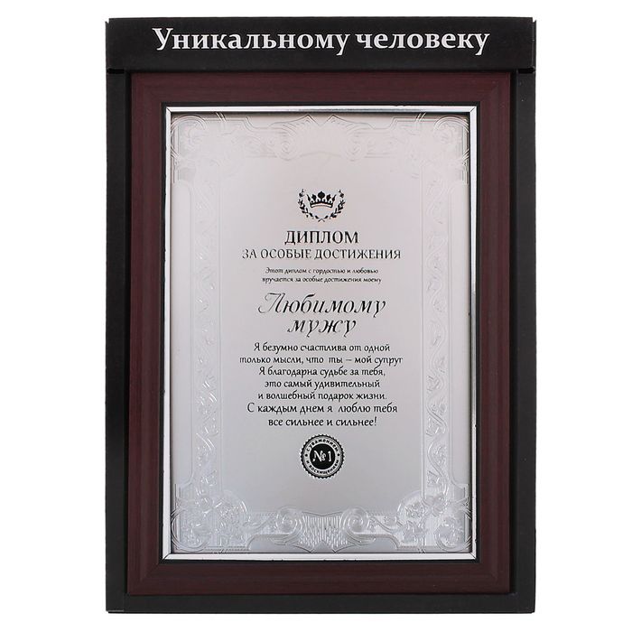Диплом в рамке "Любимому мужу" имеет рельефную фактуру с серебряным оттиском. Надписи выполнены тиснением серебряного и черного цветов. Высококачественная типография, эксклюзивный дизайн, теплые и трогательные слова - составляющие, которые делают этот диплом привлекательным для покупателя.