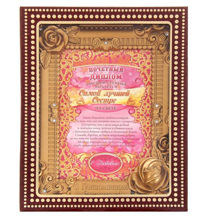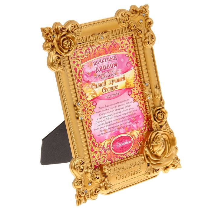 Диплом в рамке "Самой лучшей сестре на свете" в красочном авторском исполнении — настоящая находка для тех, кто ищет необычный способ поздравить дорогого человека. Он подчеркнёт торжественность момента и создаст настроение праздника! Благодаря оригинальной золотой рамке, выполненной в классическом стиле, награда станет достойным дополнением любого интерьера.