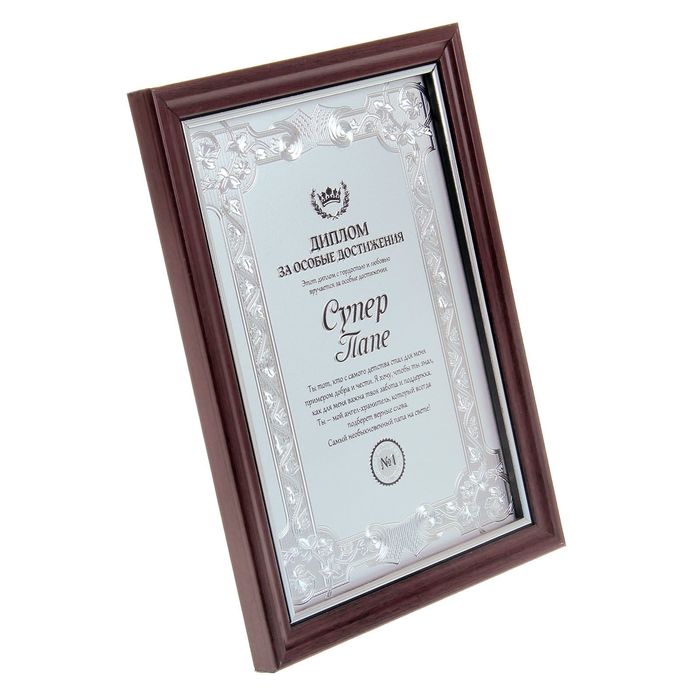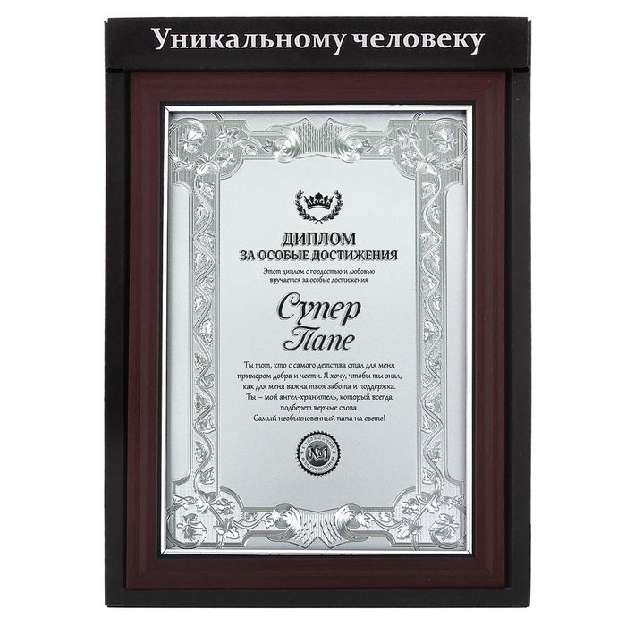 Диплом в рамке "Супер папе" имеет рельефную фактуру с серебряным оттиском. Надписи выполнены тиснением серебряного и черного цветов. Высококачественная типография, эксклюзивный дизайн, теплые и трогательные слова - составляющие, которые делают этот диплом привлекательным для покупателя.