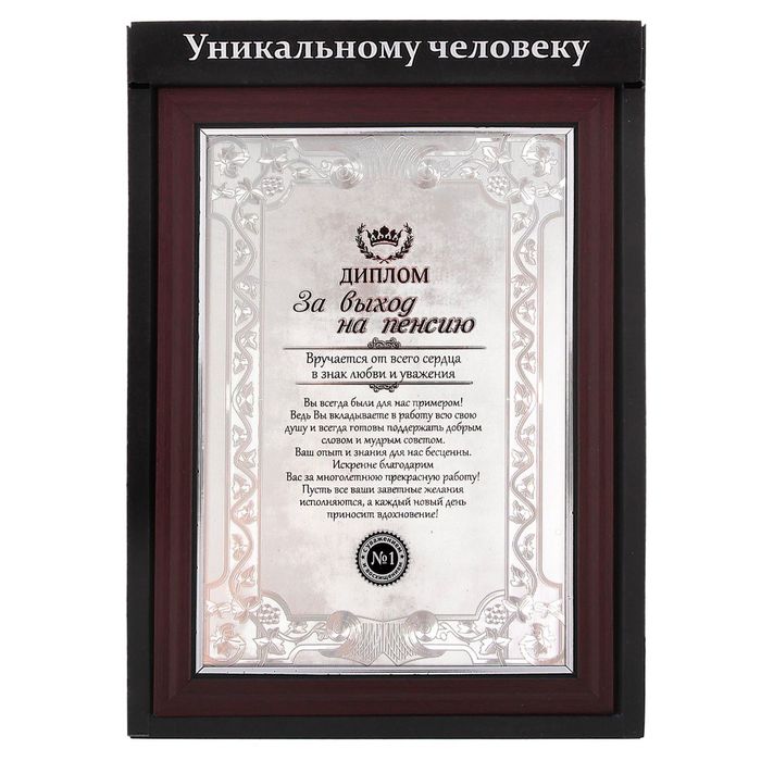 Диплом в рамке "За выход на пенсию", 20 х 14,5 х 1,5 см