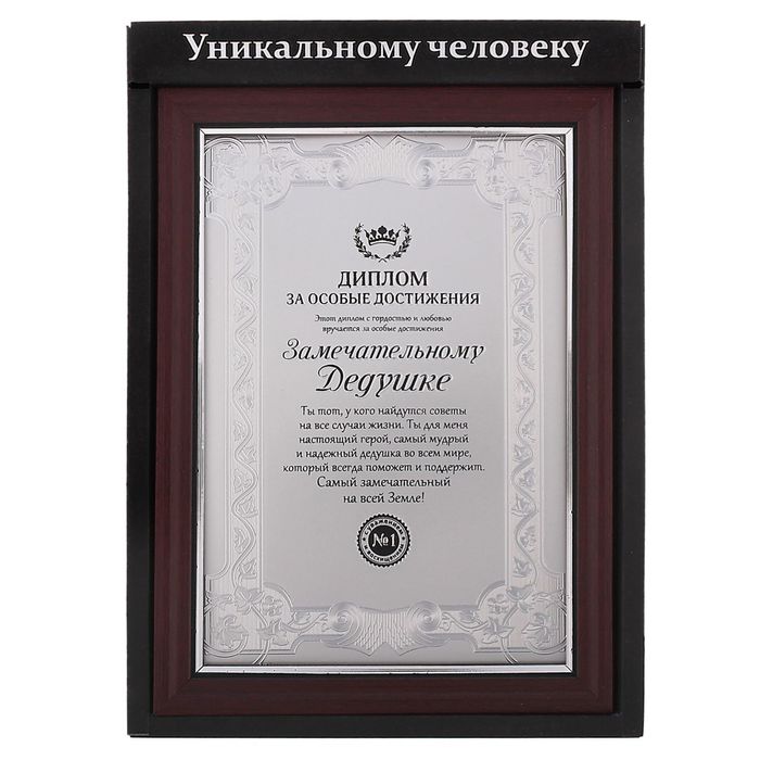 Диплом в рамке "Замечательному дедушке" имеет рельефную фактуру с серебряным оттиском. Надписи выполнены тиснением серебряного и черного цветов. Высококачественная типография, эксклюзивный дизайн, теплые и трогательные слова - составляющие, которые делают этот диплом привлекательным для покупателя.