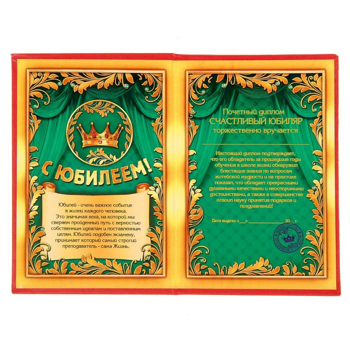 Диплом "Юбиляра" — оригинальная награда для самых достойных. Диплом выполнен из фактурного дизайнерского картона, стилизованного под кожу. Обложку украшает роскошное тиснение фольгой, а внутри вы найдёте написанные на ярком фоне душевные, тёплые слова для адресата. Также имеются поля для имени и подписи.