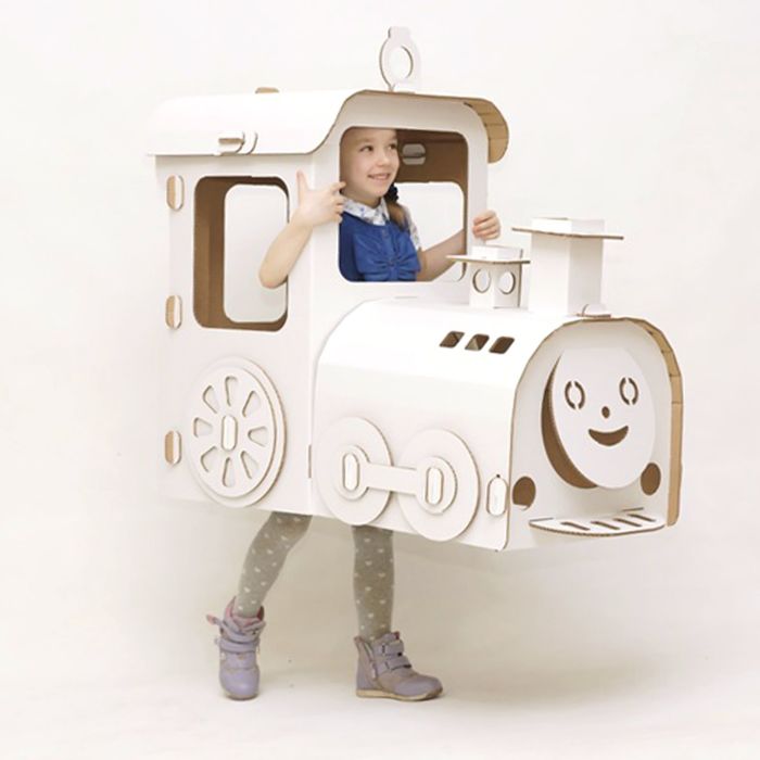 Добрый и улыбчивый паровозик легко собирается из деталей по принципу 3D-пазла без применения клея, ножниц или дополнительных креплений. Ребёнок сможет залезть внутрь, представить себя машинистом и покатать свои игрушки. Придумайте вместе с малышом имя паровозику, напишите его на кабине и разрисуйте его красками, маркерами и фломастерами. Быстро разбираемая и собираемая конструкция позволит взять его в гости, на природу или поиграть во дворе.
