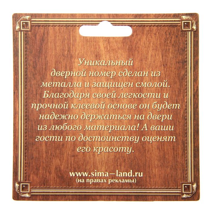 Уникальный дверной номер сделан из металла и защищён смолой. Благодаря своей лёгкости и прочной клеевой основе он будет надёжно держаться на двери из любого материла! А ваши гости по достоинству оценят красоту номера.