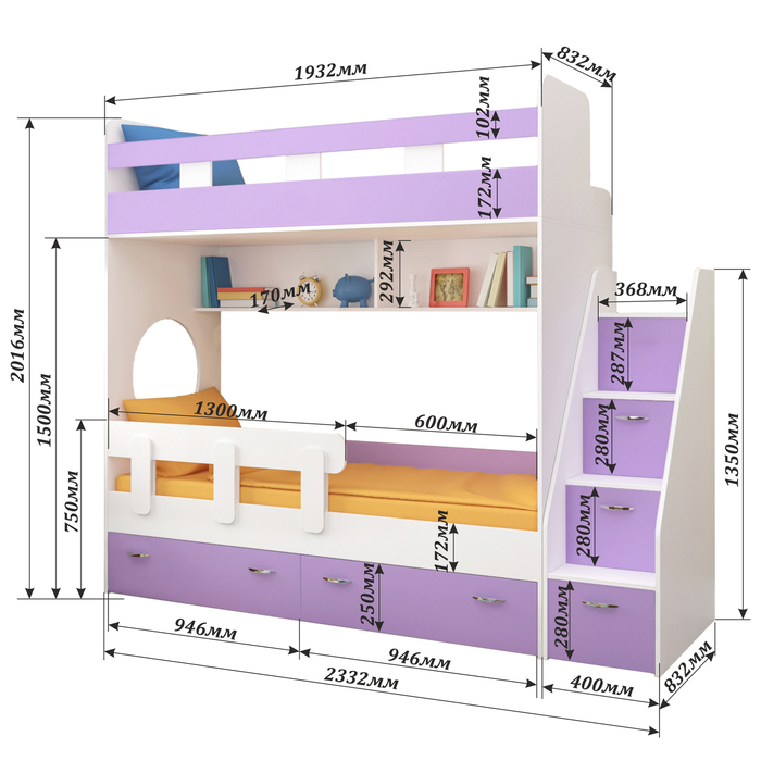 Помимо спальных мест, изделие оснащено дополнительными отделами для хранения вещей. Лестница и нижний ярус обладают вместительными выдвижными ящиками. Под верхней кроватью есть полочка для книг, фоторамок, сувениров и прочих мелочей.