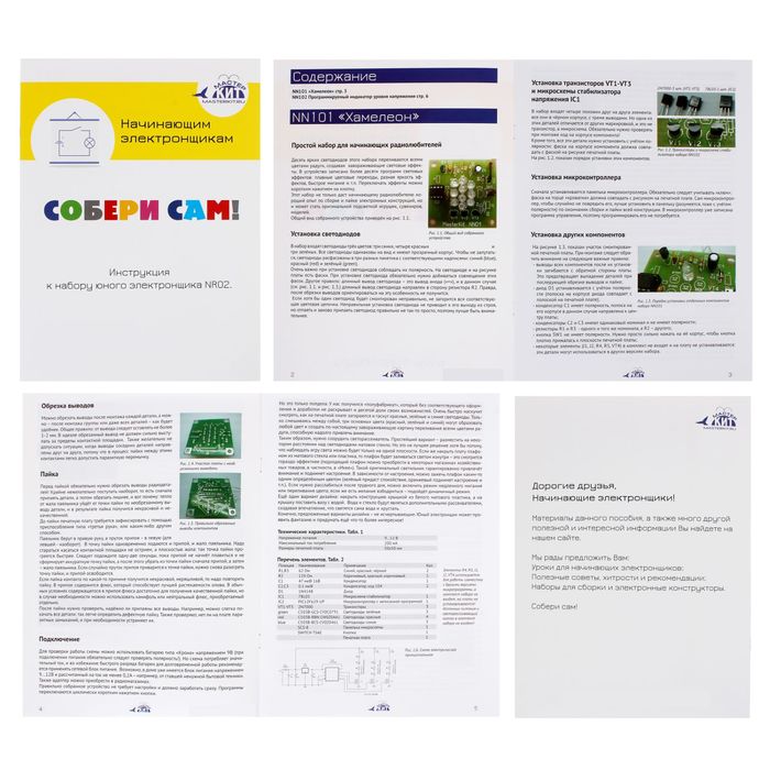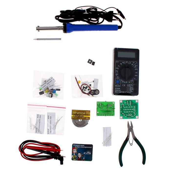 «Набор юного электронщика» — это комплект для всех, кто уже готов к сборке серьёзных и сложных схем. Благодаря высококачественным профессиональным инструментам и подробной инструкции ребёнок самостоятельно соберёт «Хамелеона» (световые эффекты на 10 светодиодах) и «Индикатор уровня напряжения».