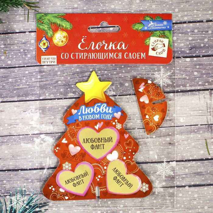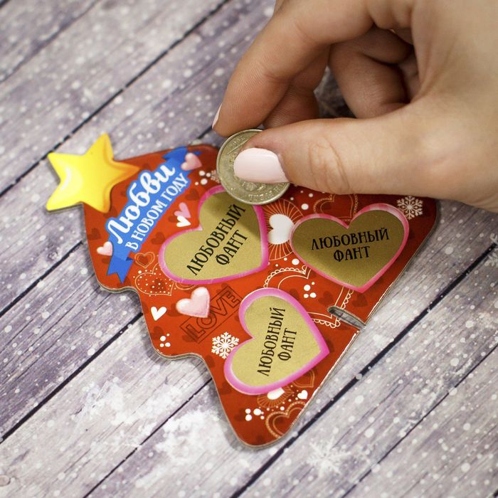 Удивить родных и коллег в новогоднюю ночь поможет сувенир с авторским дизайном. На деревце «развешаны», словно игрушки, маленькие пожелания. Они спрятались под скретч-слоем, который нужно стереть, как только часы пробьют двенадцать.