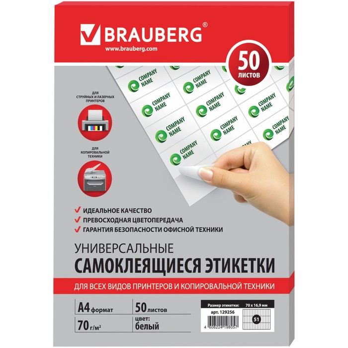Этикетка самоклеящаяся А4 50л BRAUBERG 70*16,9мм, белая, 51шт на листе 129256 поможет организовать ваше рабочее пространство и время. Востребованные предметы в удобной упаковке будут всегда под рукой в нужный момент.