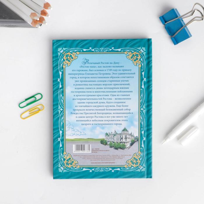 На ежедневнике изображён величавый Ростов-на-Дону. «Ростов-папа», как ласково называют его горожане, был основан в 1749 году по приказу императрицы Елизаветы Петровны. Этот удивительный город, в котором непостижимым образом сочетаются уют пронизанных солнцем старинных улочек и романтика настоящих морских приключений, издавна славится своим легендарным южным гостеприимством и архитектурными красотами.
