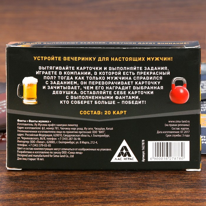 На одной стороне карточек собраны задания для настоящих мужчин. Они вам пригодятся, если у вас за столом собралась истинно мужская компания. А вот если среди присутствующих есть представительницы прекрасного пола, подключайте к игре вторую сторону фантов. Как только мужчина справится с заданием, он переворачивает карточку и зачитывает, чем его наградит выбранная девушка.