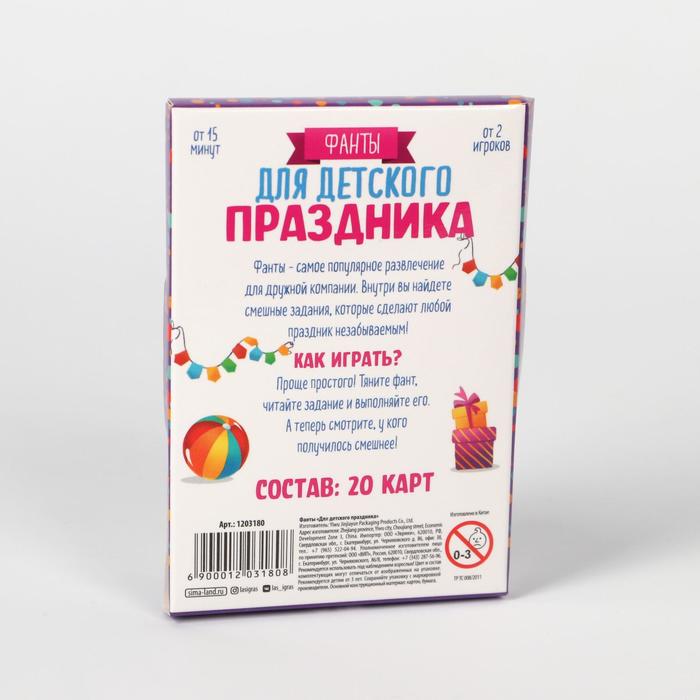 Фанты — это круто! Фанты — это весело! Убедитесь в этом сами: собирайте компанию друзей и начинайте играть. Впереди ждут активные и смешные задания, которые развеселят всех детей и сделают праздник незабываемым!