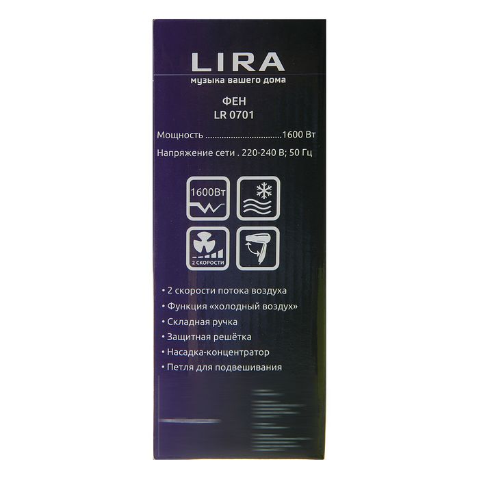 Фен LIRA станет отличным помощником в создании причёсок. С помощью различных скоростей воздушного потока и подачи холодного воздуха вы легко подберёте необходимую программу. Прибор особенно удобно использовать и брать с собой в дорогу благодаря эргономичной форме корпуса и складной ручке.