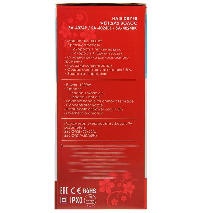 Фен для волос Sakura SA-4024P, 1000 Вт, 2 скорости, 2 температурных режима, розовый