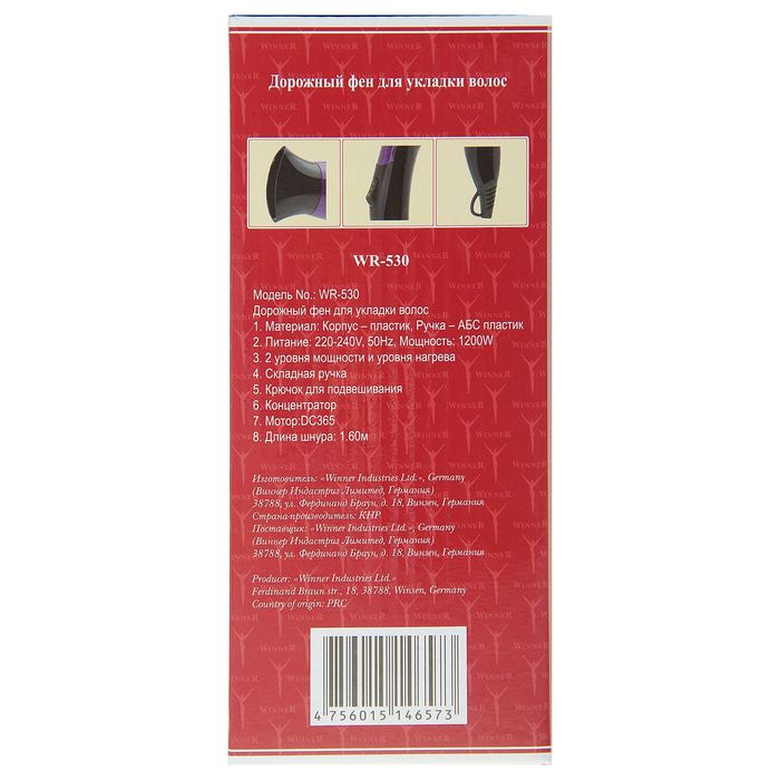 Фен для волос Winner WR-530, 1200 Вт, 2 скорости, 2 температурных режима, складная ручка