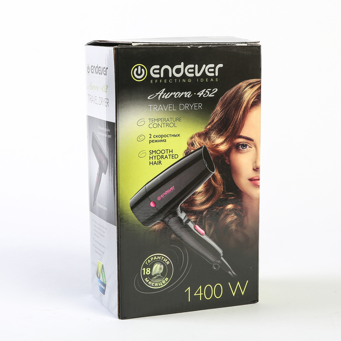 Мы предлагаем широкий ассортимент бытовой электроники. Фен Endever Aurora 452, 1400 Вт, 2 режима, 2 скорости, черный — это полезный и актуальный прибор, который прослужит долго и сделает вашу жизнь проще.