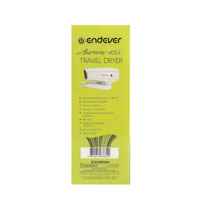Фен Endever Aurora 453, 1400 Вт, 2 режима, 2 насадки, белый