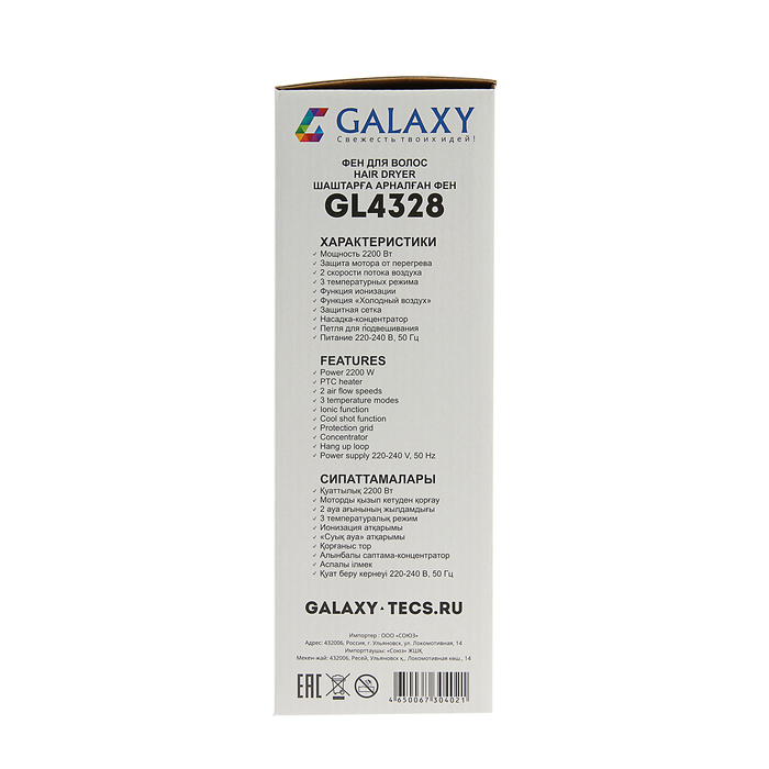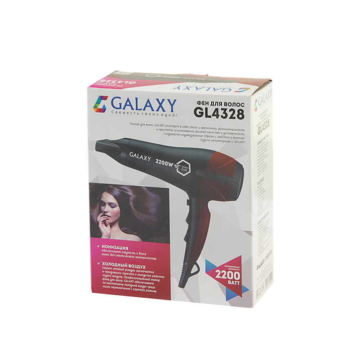 Мы предлагаем широкий ассортимент бытовой электроники. Фен Galaxy GL 4328, 2200 Вт, 2 скорости, 3 темп. режима, «Холодный воздух», ионизация — это полезный и актуальный прибор, который прослужит долго и сделает вашу жизнь проще.