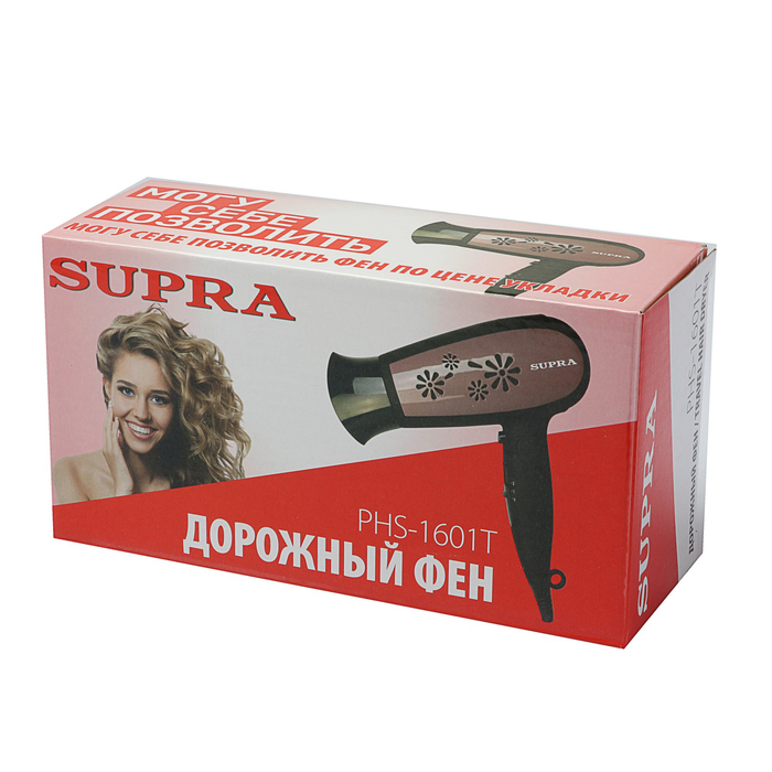 Мы предлагаем широкий ассортимент бытовой электроники. Фен SUPRA PHS-1601T, 1600 Вт, 2 скорости, складная ручка, черный — это полезный и актуальный прибор, который прослужит долго и сделает вашу жизнь проще.