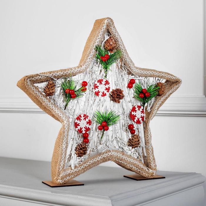 Новогодняя фигура с еловыми веточками, шишками и тканевой окантовкой привнесёт в ваш дом атмосферу уюта, а её тёплый свет создаст праздничное настроение.