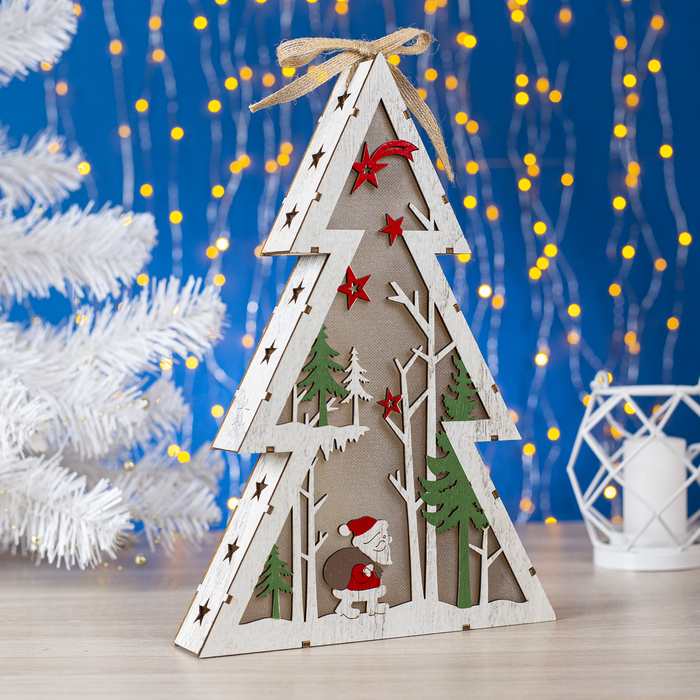 Фигура деревянная "Ёлка с Дед Морозом", 29х20х4 см, 2*AA (не в компл.) 5 LED, белая