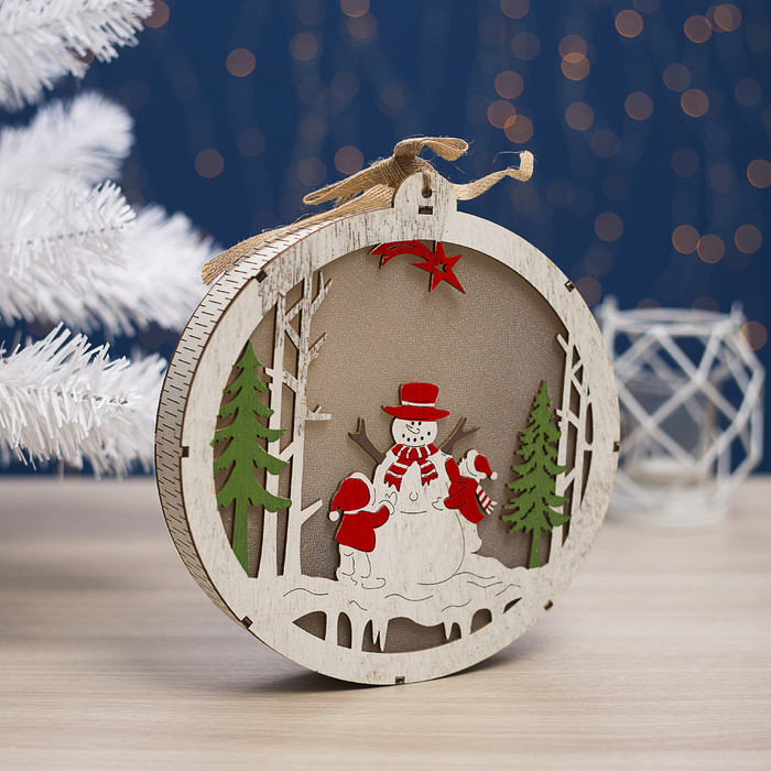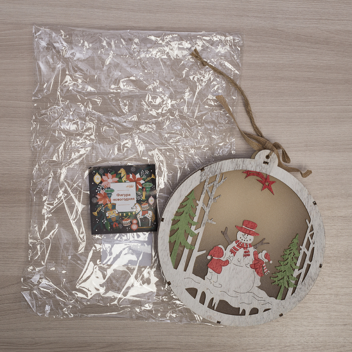 Фигура деревянная "Шарик Дети и Снеговик", 19х19х3.5 см, 2*AA (не в компл.) 5 LED, белый