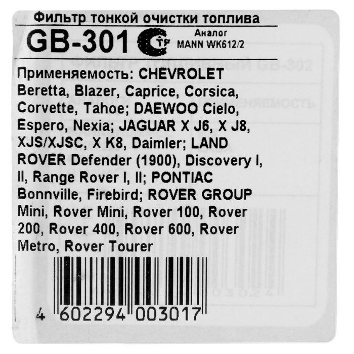 Фильтр BIG FILTER GB-301 служит для очищения топлива от пыли и других мелких частиц, которые попадают в двигатель от бензобака автомобиля. Благодаря качественным изделиям, вы увеличиваете интервал между их заменой, продлеваете срок службы основных конструктивных элементов двигателя транспортного средства.