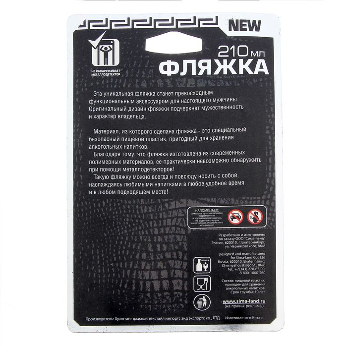 Сувенир прошёл тестирование, а потому мы с уверенностью сообщаем: он не протекает и отлично подходит для хранения алкоголя (запах не въедается, стенки не разъедаются). Товар сертифицирован.
