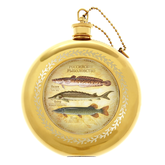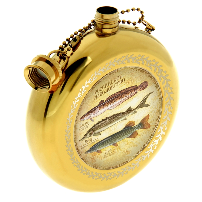 Фляжка "Российское рыболовство" 240 мл - эксклюзивный презент в подарочной упаковке, выполненный в торжественном стиле. В центре изделия – оригинальное изображение в стиле русской живописи с яркими красками и выразительными высказываниями, придающее аксессуару неповторимый роскошный вид. Специальное плоское дно позволяет использовать фляжку не только по её прямому назначению - как емкость, но и как прекрасный сувенир, украшающий сувенир. Крышка фляжки прикреплена специальной цепочкой, для избежания потери во время эксплуатации.