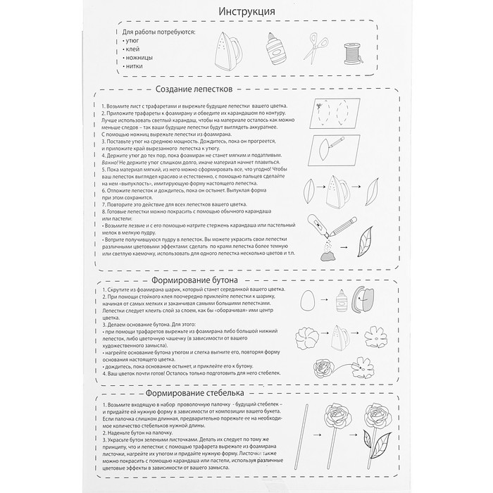 При работе с набором вам понадобится нагревательный прибор (утюг). Он придаст плоским деталям объём. А также не забудьте клей, ножницы и нитки.