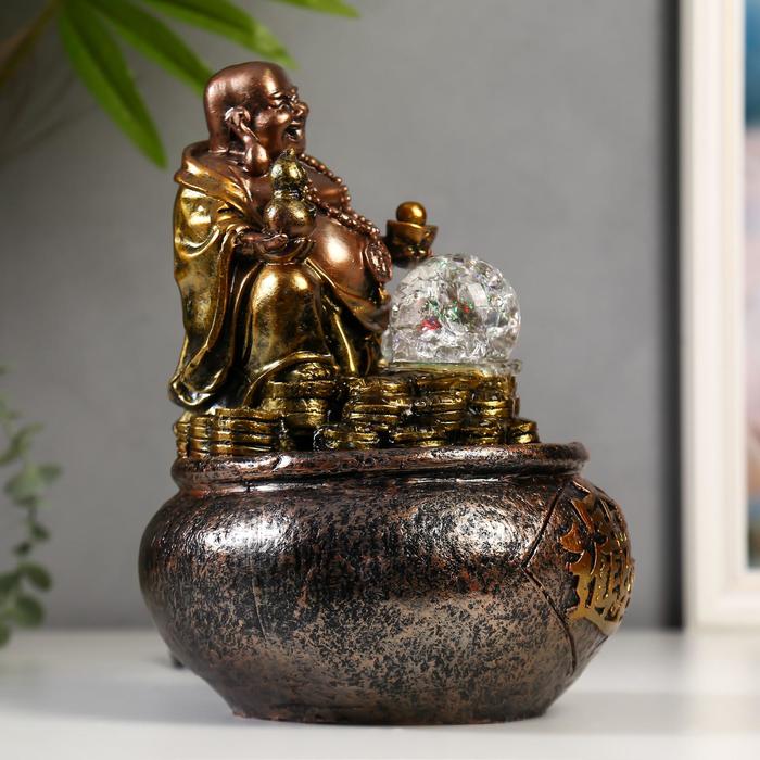 Фонтан настольный полистоун 220В "Хотей с горой золотых монет" бронза 28х17х17 см