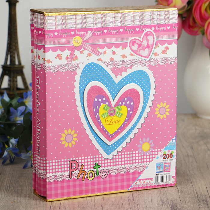 Фотоальбом на 200 ф. 10х15см "Сердечко в горошек" объемная картинка в кор.МИКС 26,5х21х5,5см