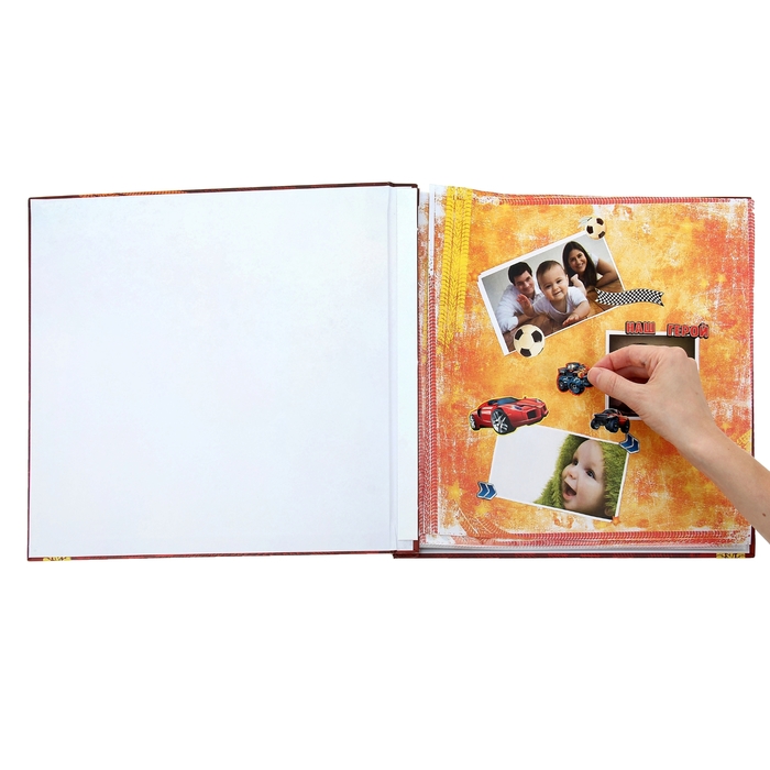 2. Закрепите фотографии с помощью клея для бумаги либо с использованием декоративных наклеек, входящих в набор, аккуратно отделяя их от бумажной основы.
