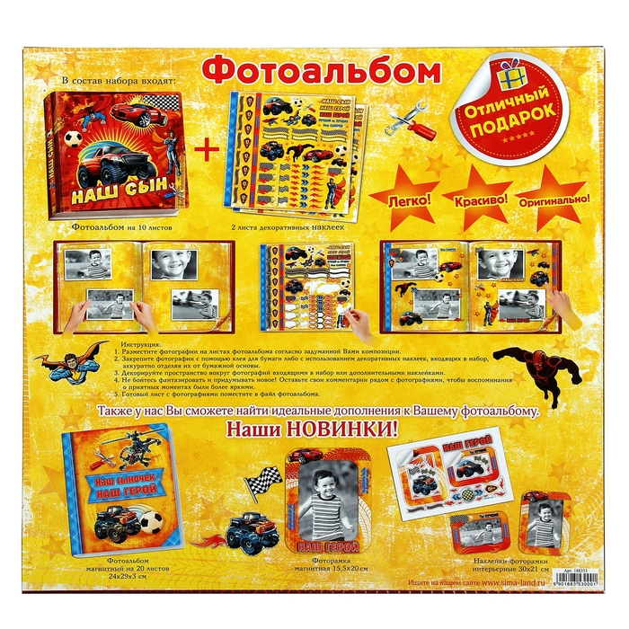 Фотоальбом в подарочной упаковке "Наш сын"- отличный подарок на память, так как предназначен для хранения самого дорогого - фотографий Вашего сына! Фотоальбом не простой, к нему прилагается набор ярких наклеек для оформления фотографий с забавными картинками и надписями..