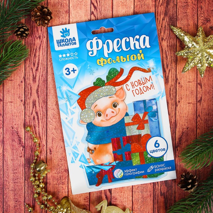 Фреска цветной фольгой "С Новым годом!", хрюшка с подарками