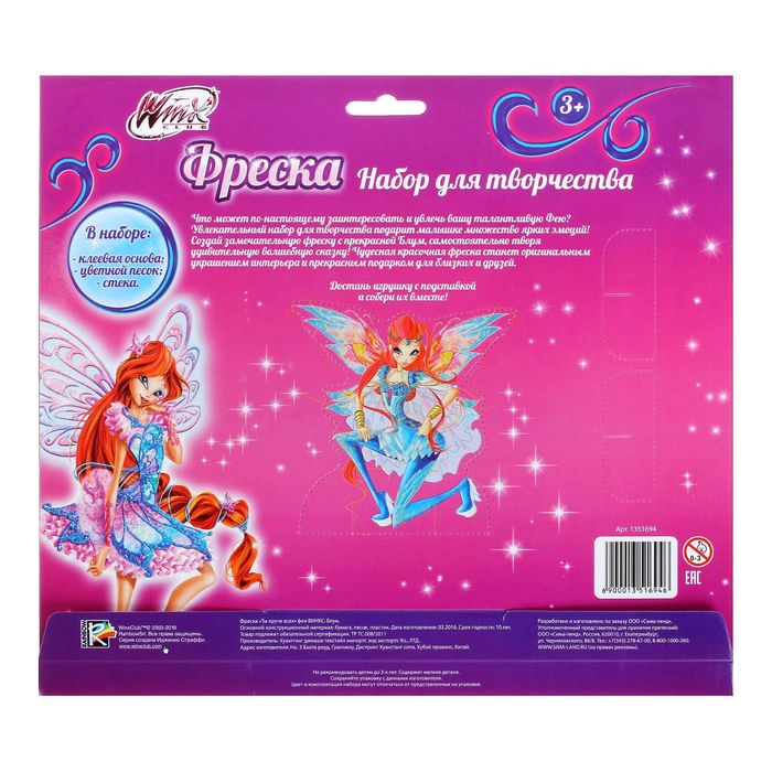 Оригинальный набор для творчества с любимыми волшебницами Винкс подарит малышке множество положительных эмоций! Он надолго увлечёт вашу талантливую фею. Чудесная фреска станет интересным украшением интерьера или прекрасным подарком для друзей и близких.