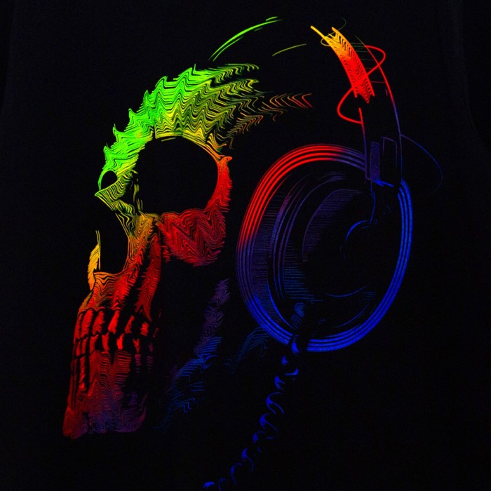 Футболка с необычным принтом выполнена из натурального хлопка. Флуоресцентный рисунок начинает светиться, когда на него попадает ультрафиолетовое излучение.