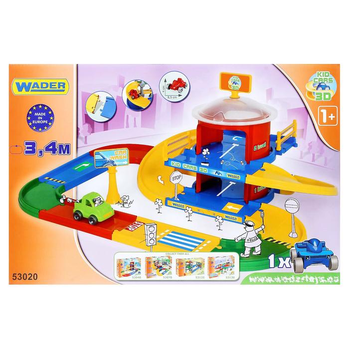 Каждый юный водитель мечтает о своём гараже. Двухэтажная парковка ТМ Wader вместит все любимые машинки размером 4 × 8,5 см и меньше. Все элементы соединяются между собой и составляют трассу протяжённостью до 3,4 метров.
