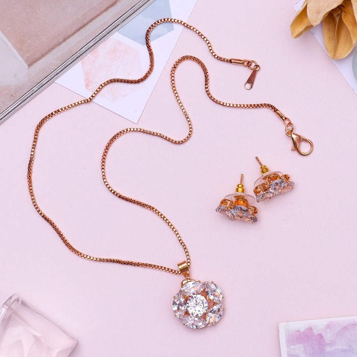 Гарнитур 2 предмета: серьги, кулон "Циркон" изыск, цветок, цвет белый в золоте, 45 см