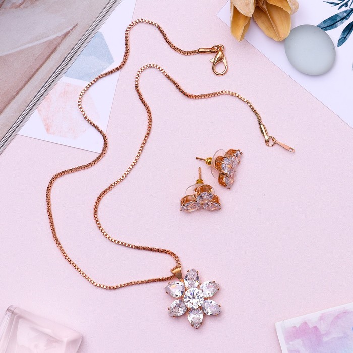 Гарнитур 2 предмета: серьги, кулон "Циркон" изыск, цветок, цвет белый в золоте, 45 см
