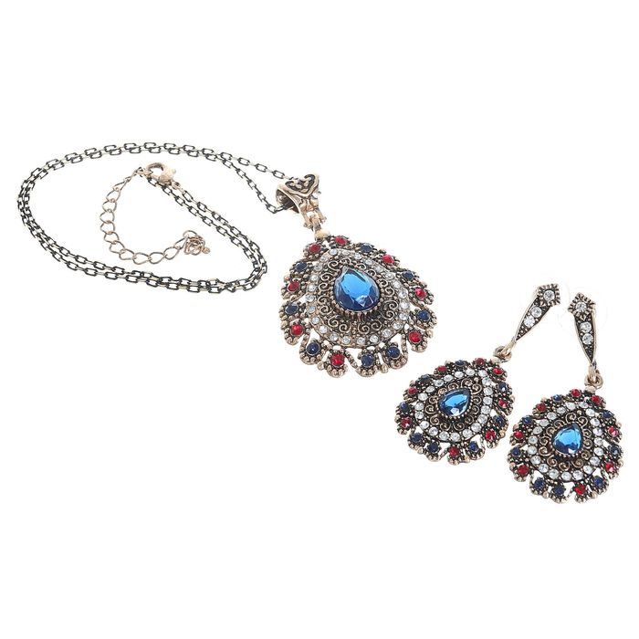 Ни один стиляга не будет выглядеть современно без искусно подобранных украшений, которые завершат его образ! Бижутерия — это современная недорогая альтернатива изделиям из золота и прочих драгоценных металлов. Гарнитур 2 предмета: серьги, кулон "Великолепный век" капля, цветной в чернёном золоте, 45см — это то, что добавит вам шарма!