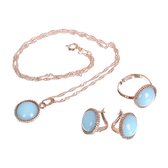 Ни один стиляга не будет выглядеть современно без искусно подобранных украшений, которые завершат его образ! Бижутерия — это современная недорогая альтернатива изделиям из золота и прочих драгоценных металлов. Гарнитур 3 предмета: серьги, кулон, кольцо безразмерное "Эдель" круг, цвет светло-голубой в золоте — это то, что добавит вам шарма!