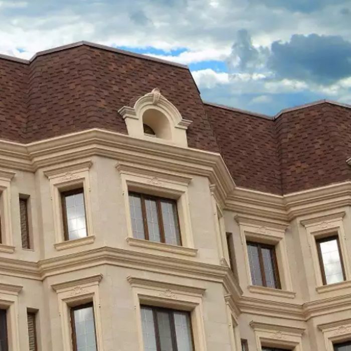 Вы можете дополнить гибкую черепицу кровельными элементами — коньками и карнизами. При повреждении одного из них не требуется обновлять всю кровлю, достаточно заменить повреждённые части.