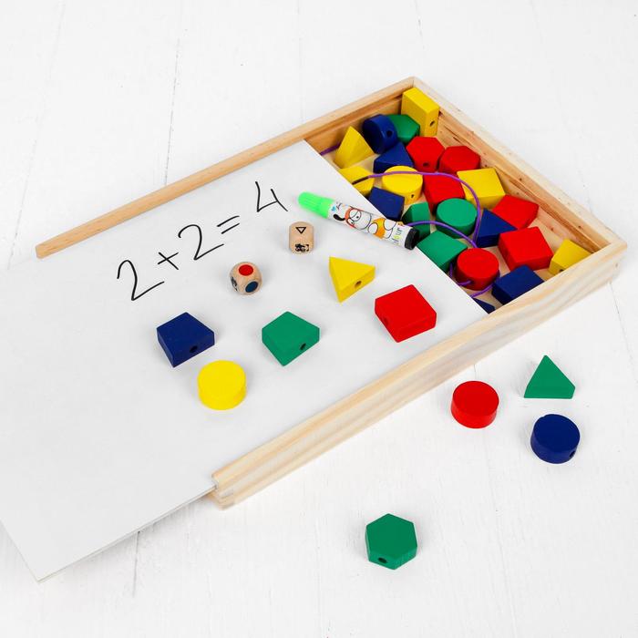 Малыш может писать маркером на доске, нанизывать фигурки на шнурок, укладывать их в рамку, подсчитывать количество схожих элементов. Два игральных кубика с разными цветами и геометрическими фигурами превратят задания в увлекательную игру. Если у вашего ребёнка праздник, и к нему пришла большая компания, можно предложить гостям по очереди кидать кубик и укладывать элементы определённой формы в подходящую ячейку. Набор находится в компактном деревянном пенале, который удобно хранить или брать с собой.