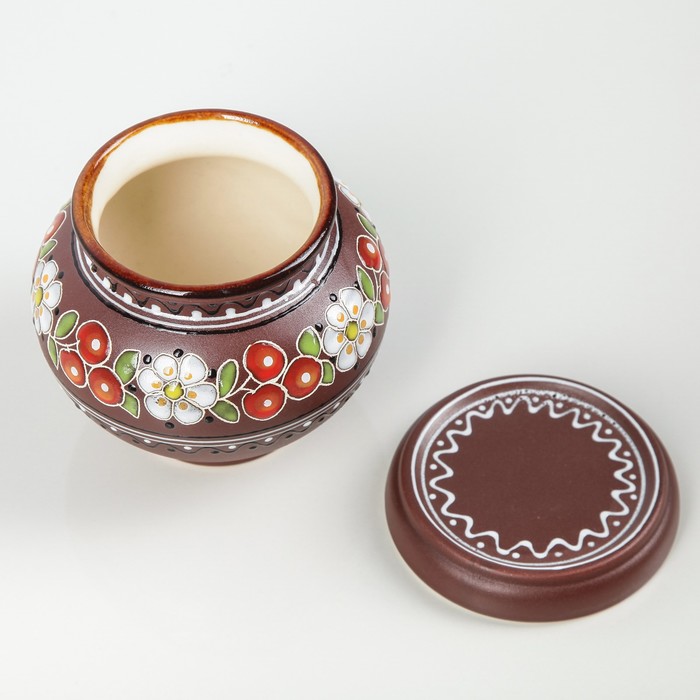 Такой горшочек — ценное приобретение для кухни, которое даёт невероятные возможности для кулинарных импровизаций. Процесс приготовления пищи в такой посуде очень прост. Изделие изготовлено вручную из керамики и прекрасно дополнит традиционный интерьер русской кухни.