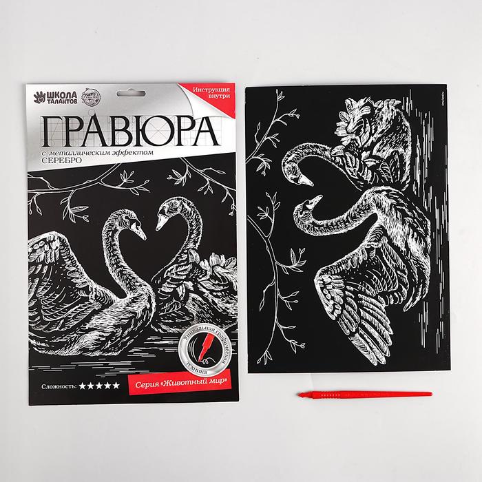 Гравюра "Лебеди" с металлическим эффектом серебра А4 + штихель