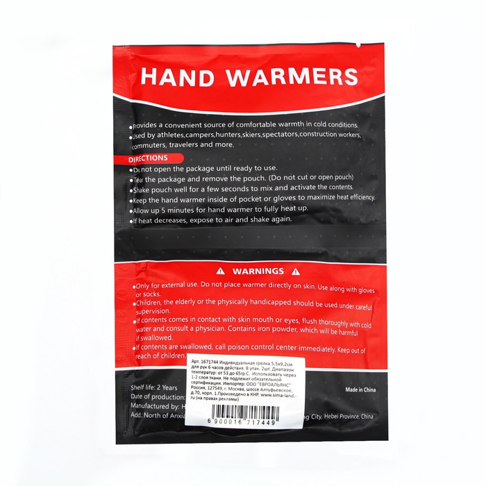 Аксессуар мало весит и практически не занимает места в туристической экипировке или тревожном чемоданчике автомобилиста. В нужный момент достаточно достать и встряхнуть упаковку. Пакет разогревается до максимальной температуры в течение 10 минут.