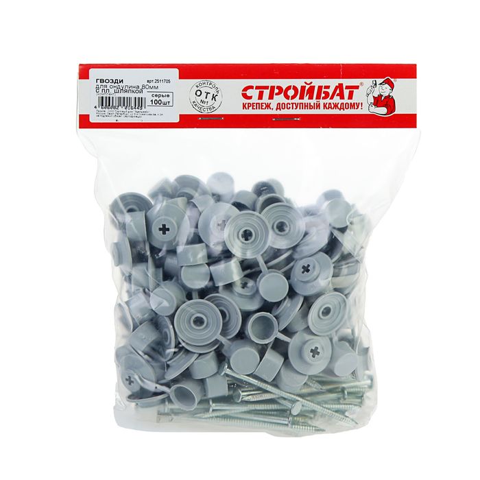 Гвозди для ондулина "СТРОЙБАТ", 80 мм, с пластиковой шляпкой, серые, 100 шт.
