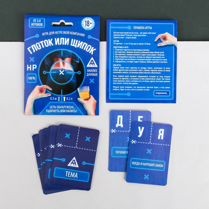 Первый участник начинает придумывать историю на тему, которая выпала на карточке, а остальные внимательно его слушают. Как только он произнесёт слово, в котором есть эта буква, все кричат: «Глоток или щипок?». Если игрок угадает заветную букву, то будет выпивать, а если нет — все щипают его за попу!