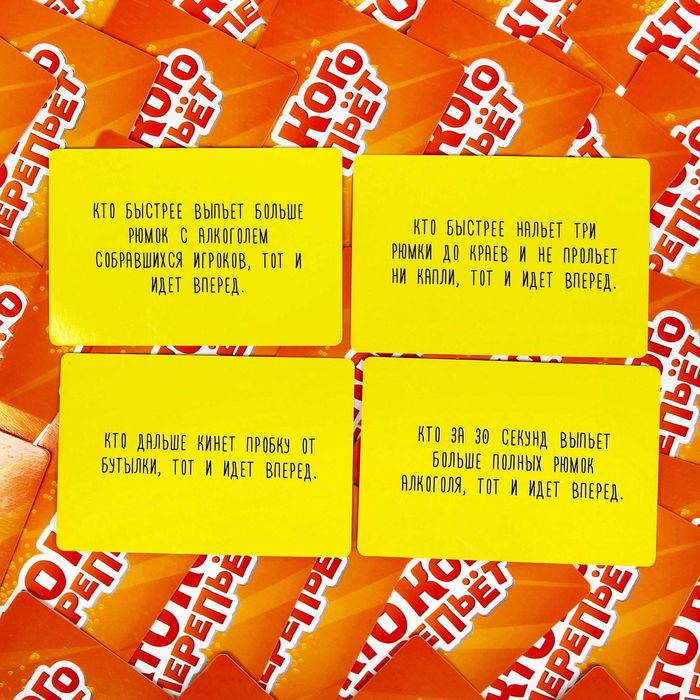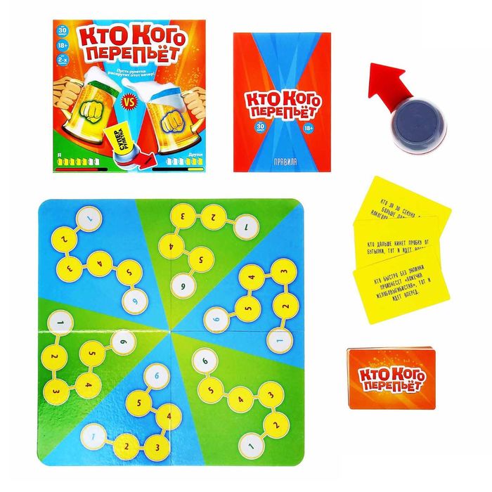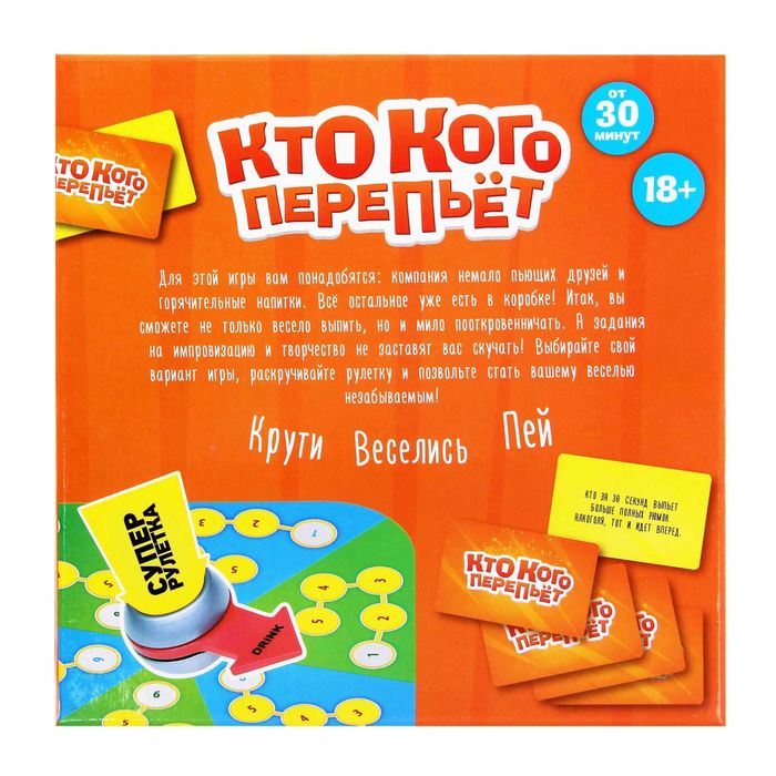Сделать это очень просто с суперрулеткой! В наборе вы найдете игровое поле, карточки и, конечно, суперрулетку, которая определит пары участников алкогольных поединков. Ваша задача - крутить рулетку, тянуть карточку и выполнять задание с нее быстрее и смешнее игрока из вашей пары. Справились? Передвигайте фишку на игровом поле на ход вперед. Кто быстрее дойдет до финиша – тот и станет победителем!